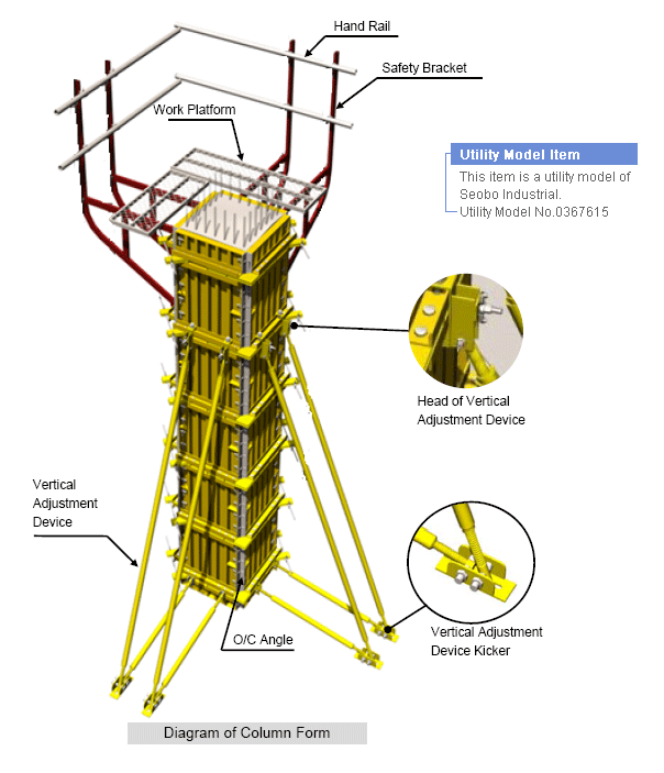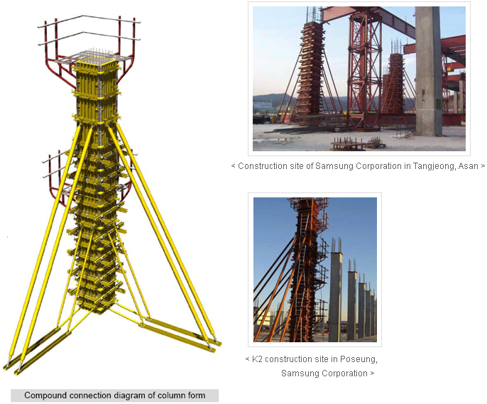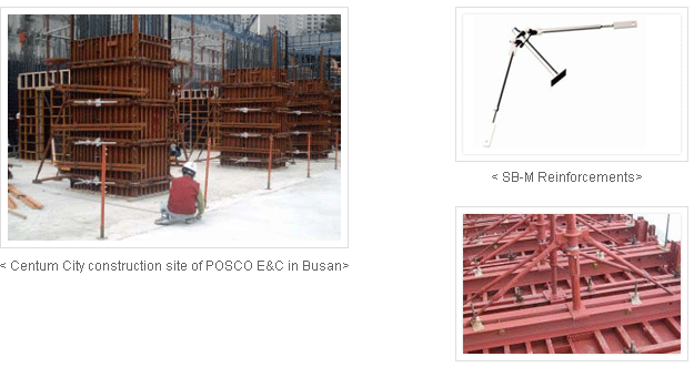 SB column steel form comprises a reinforced steel panel integrating a steel plate, common joist and sleeper. Unlike existing column formwork, this system form is assembled on the floor in advance and installed on site using equipment.