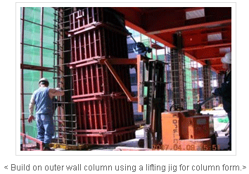 If the site makes it difficult or restricts the use of a tower crane, set the lifting jig on an electronic forklift and move and install the L-shaped or channel-shaped column form after assembly.