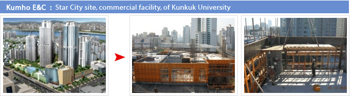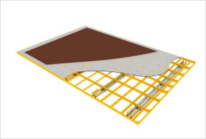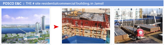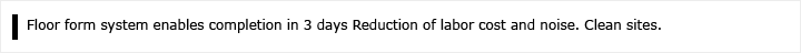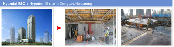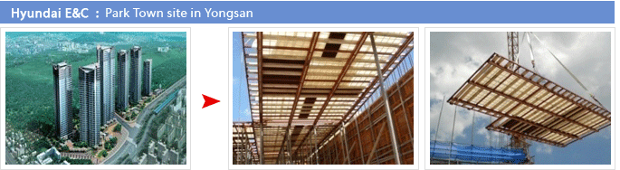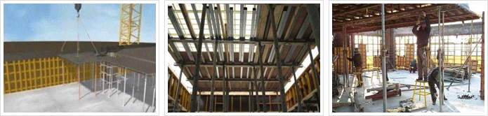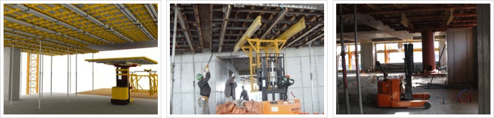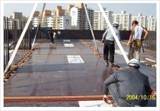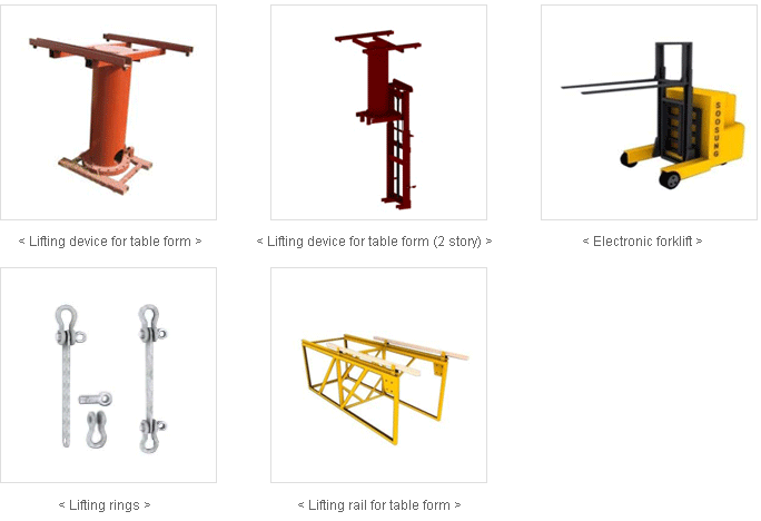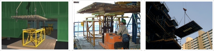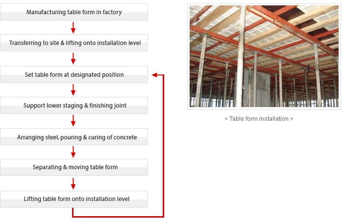 The table form is a large beam system devised to install integrated joists, sleepers and floor slabs by vertical and horizontal movement and assembly. Since slab form is installed, dismantled, lifted and reinstalled using equipment, the table form can shorten the time needed for work and reduce labor costs. Table forms are mainly used to reduce the length of work needed for skyscrapers. |