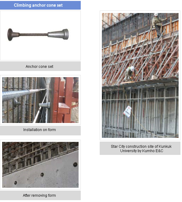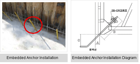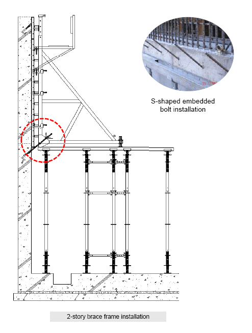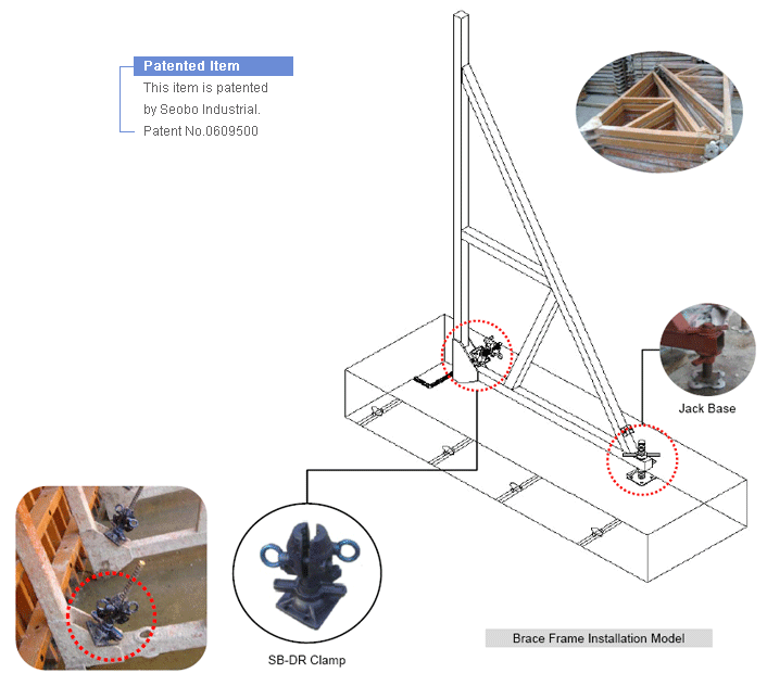 The brace frame is a steel truss support for plywood forms using embedded anchor bolts without form tie While existing plywood forms is installed using the expensive Diwydag bolts as an embedded anchor bolt, the SB-DR clamp uses on-site steel remnants as the embedded anchor bolt to reduce material costs by half.