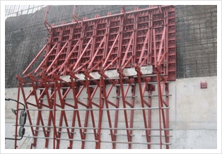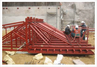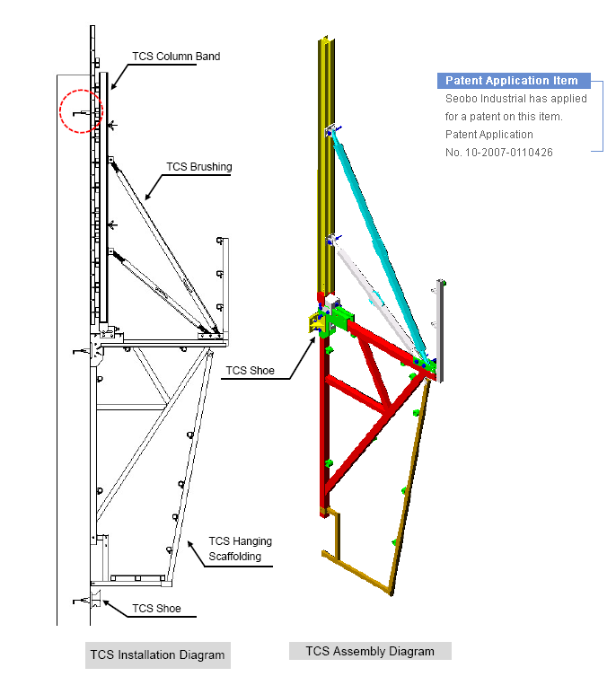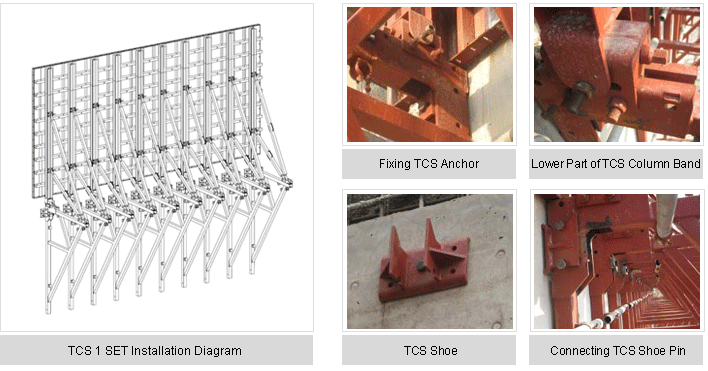 A TCS is required when a wall needs to be consecutively built upward. It is a climbing system for one side face walls of building walls using an integrated form and support system without staging.