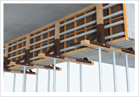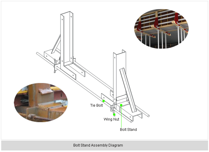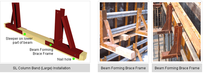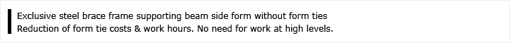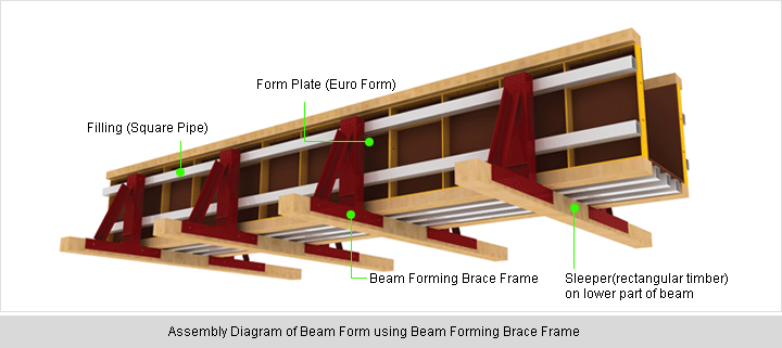 Support the entire side of beam by inserting a rectangular timber into Beam Forming Brace Frame as the deeper beam has a higher concrete lateral pressure working on the beam side. Prevent lateral pressure separation by fastening bolts.