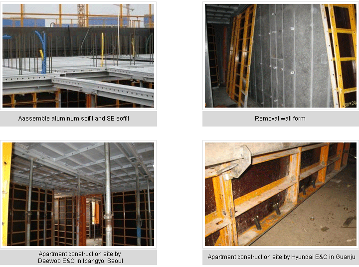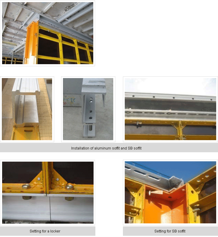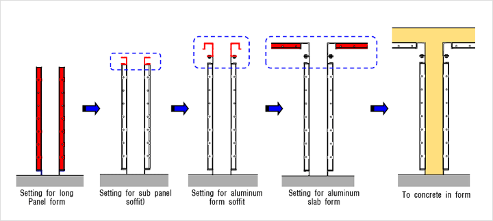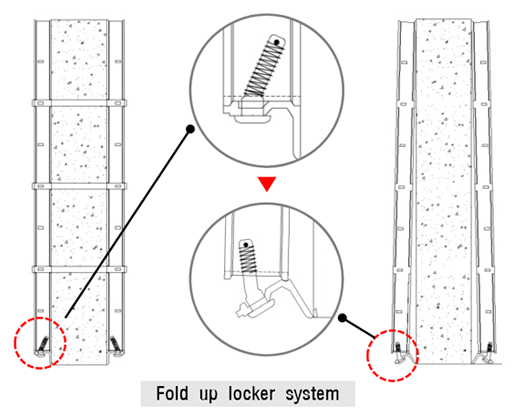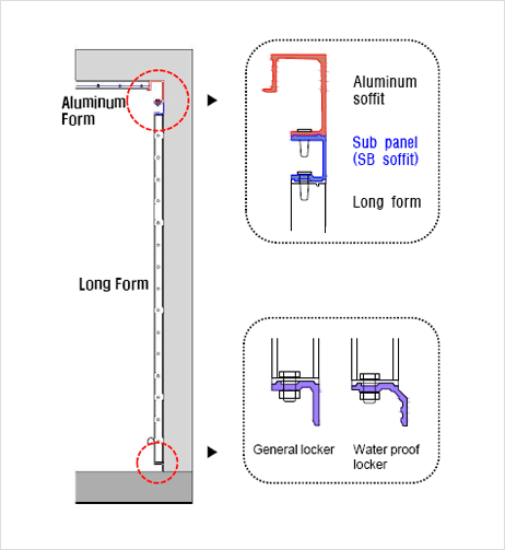 Our system is consisted of basic panel with long-form, and locker for bottom part and support panel to meet wall floor-height for top part, and all these parts will be connected and assembled to make Wall Form.